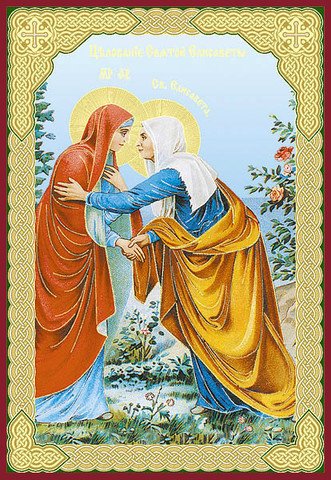 Отображает событие, описанное в Евангелии: «Встав же Мария во дни сии, с поспешностью пошла в нагорную страну, в город Иудин, и вошла в дом Захарии, и приветствовала Елисавету. Когда Елисавета услышала приветствие Марии, взыграл младенец во чреве ее; и Елисавета исполнилась Святаго Духа» (Евангелие от Луки, глава 1, стихи 39-41).