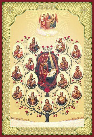 "Древо Богородицы" - изображение наиболее чтимых икон Божией Матери в виде медальонов на ветвях символического дерева вокруг иконы Рождества Христова. Данную икону не следует путать с иконой "Древо Иессеево", где на похожем дереве изображена родословная Иисуса Христа по линии Пресвятой Богородицы.