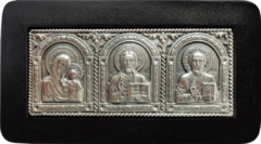 Авто тройник - Казанская, Спаситель, св.Николай Чуд. серебрение, кожа, скотч (9,5х4,5)